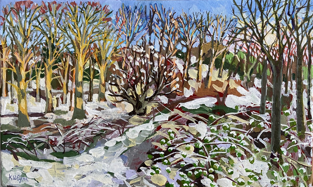 This painting was created in response to the first fresh snowfall of 2026, and how it made the woodland sparkle in the clear winter sunlight, with the sun at a very low aspect. I have tried to convey the feeling of tingling coldness, and the stark contrasts and deep shadows, and how some of the trees were glowing golden in the sun. It was a breathtaking afternoon. I finished the painting in the studio so I could add in detail that wasn't possible in the outdoors, due to the cold.