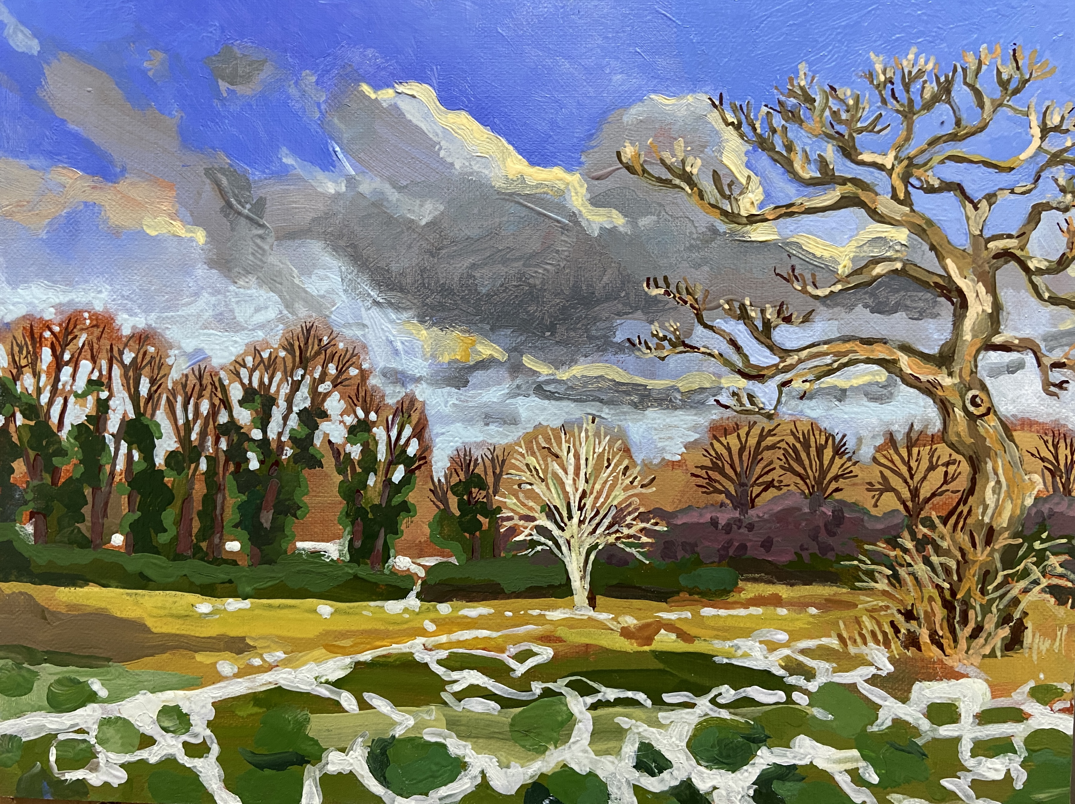 Painted mainly on location, this small painting captures the essence of the December day; the briskness of the cold wind blowing the clouds across the sky and the thin clear winter light. This is the first painting in the Down to Earth plein air series, seeking to reconnect to the earth and its cycle of the seasons through direct observation, bringing a tangible vigour and freshness to the work.