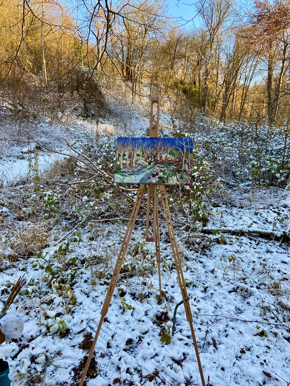 This painting was created in response to the first fresh snowfall of 2026, and how it made the woodland sparkle in the clear winter sunlight, with the sun at a very low aspect. I have tried to convey the feeling of tingling coldness, and the stark contrasts and deep shadows, and how some of the trees were glowing golden in the sun. It was a breathtaking afternoon. I finished the painting in the studio so I could add in detail that wasn't possible in the outdoors, due to the cold.